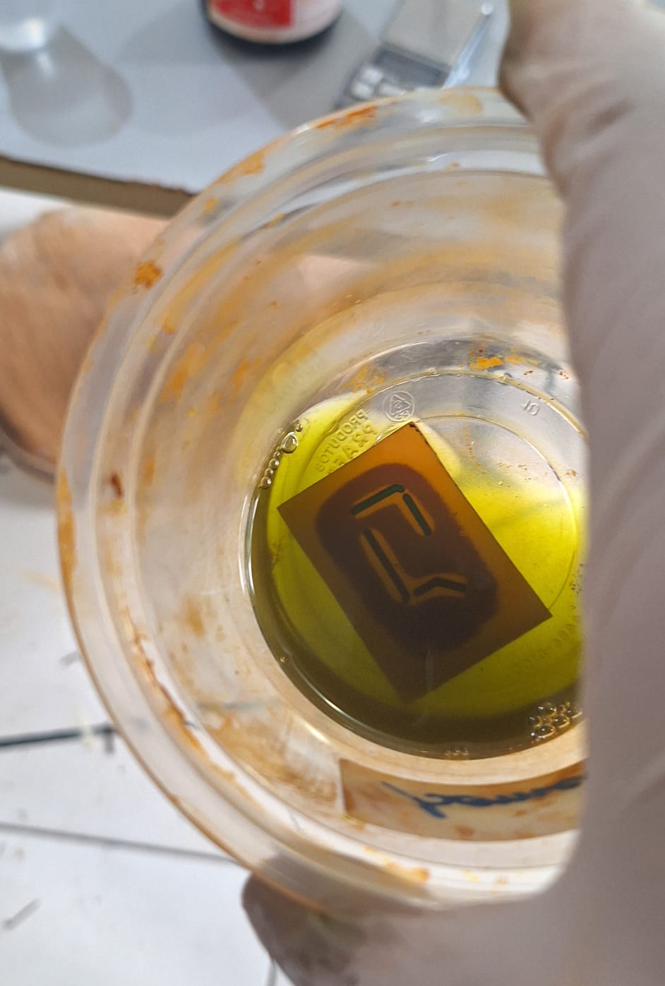Ao passar pelo processo de mascaramento e após retirar o adesivo apenas da área que se deseja reaizar a corrosão a placa é então mergulhada em uma solução de percloreto de ferro onde para cada 100g de água é colocado 50g de percloreto.
